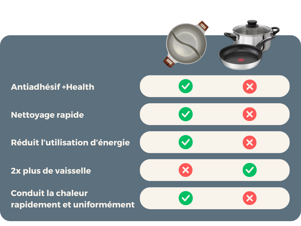 La casserole permet de cuisiner deux plats simultanément, chacun avec des touches personnalisées. Imaginez la possibilité de préparer un plat avec des sauces épicées ou avec des oignons d'un côté et sans de l'autre. Vous pouvez également cuisiner un plat avec de la viande d'un côté et opter pour du poisson ou du tofu de l'autre, offrant ainsi une flexibilité inégalée. Cette polyvalence rend la cuisine plus créative, vous permettant de satisfaire une variété de goûts et de préférences au sein d'une seule et même casserole.